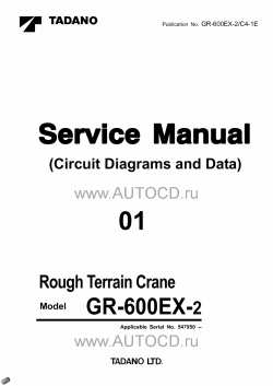 Заводская инструкция по ремонту крана Тадано - Tadano Rough Terrain Crane GR-600EX-2 содержит подробную информацию о сборке и разборке агрегатов, процедур диагностики, электрические схемы, моменты затяжек и др. Информация доступны на Английском и Японских языках. Если модель поставлялась только на локальный рынок Японии инструкции будут на Японском языке, книга с электрическими и гидравлическими схемами будут на английском.